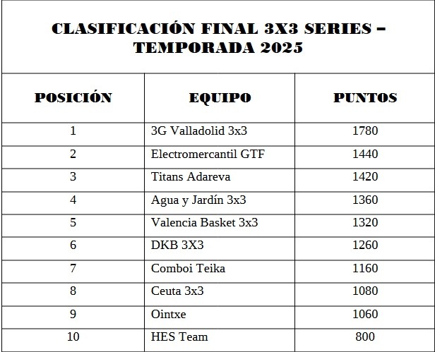 A pesar de no obtener un premio por ello, la clasificación sitúa a 3G Valladolid 3×3 como campeón. Para el club, uno de los principales objetivos está cumplido: el de competir al mayor nivel en el circuito nacional.
