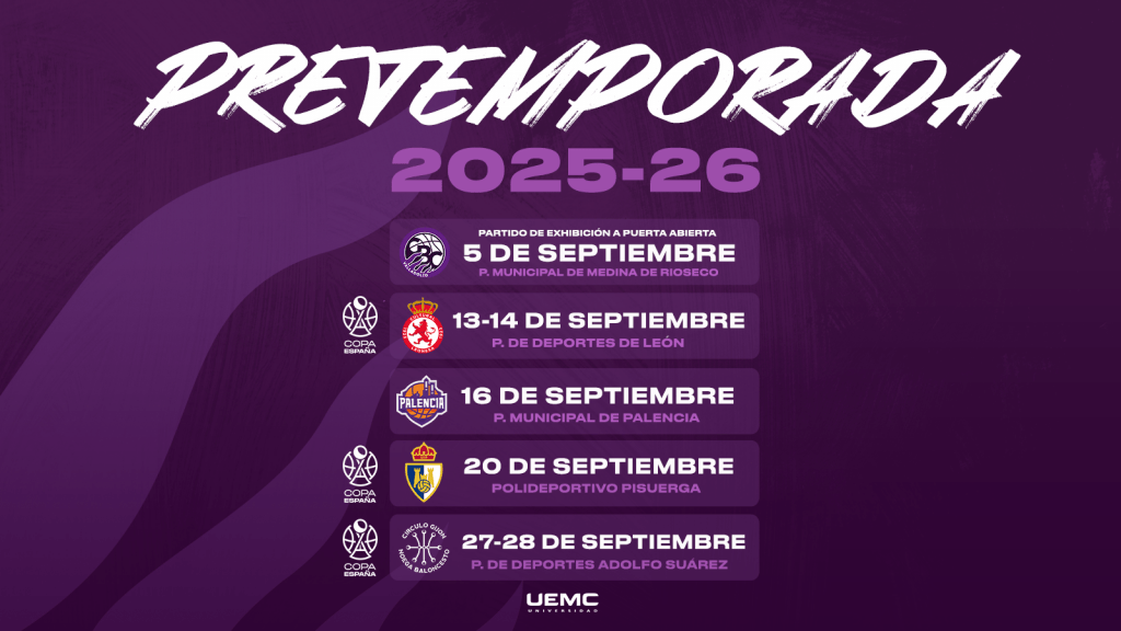 Entremedias de la exhibición y el amistoso en tierras palentinas comenzará la Copa España contra la Cultural y Deportiva Leonesa. El partido será el 14 de septiembre (18:30) en el Pabellón de los Deportes de León. El conjunto morado afrontará después los otros dos encuentros pertenecientes a la Copa España. El 20 de septiembre (19:00) en Pisuerga ante el SDP Ponferrada y cerrará la pretemporada, y la fase de grupos del torneo copero, el 27 de septiembre (20:00) contra el Circulo Gijón Baloncesto en el Pabellón de los Deportes Adolfo Suarez.