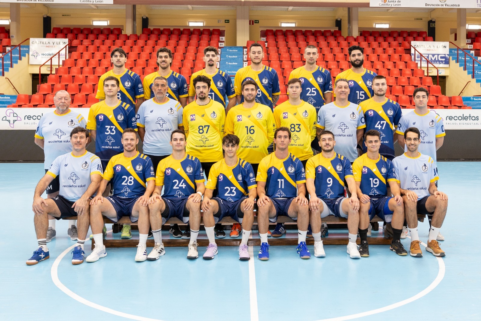 El Recoletas Atlético Valladolid tuvo este viernes la foto oficial de la plantilla para la campaña 2025-26. Los integrantes de los gladiadores azules posaron a pie de pista con la primera equipación azul de juego en el caso de los jugadores, la primera equipación amarilla los porteros y la camiseta celeste y pantalón negro corto de entrenamiento los técnicos.
